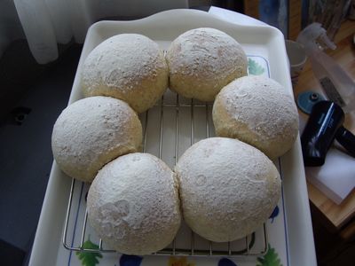 タイムログ : マーガリンが入ってから捏ね25分。一次発酵1時間。6つに分割後ベンチタイム15分。成型後二次発酵35分。200度のオーブンで20分。180度で10分。